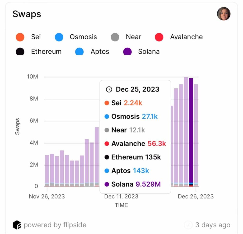 Según el análisis de AMBCrypto de las estadísticas de Flipside, las transacciones de swap diarias en Solana aumentaron a 9,25 millones el día de Navidad. En comparación, la red de contratos inteligentes más grande, Ethereum [ETH] sólo pudo registrar 135.000 transacciones.