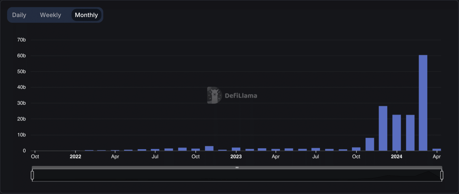 Esto marcó un aumento del 172% con respecto a los 22.000 millones de dólares registrados en el volumen de DEX en febrero.