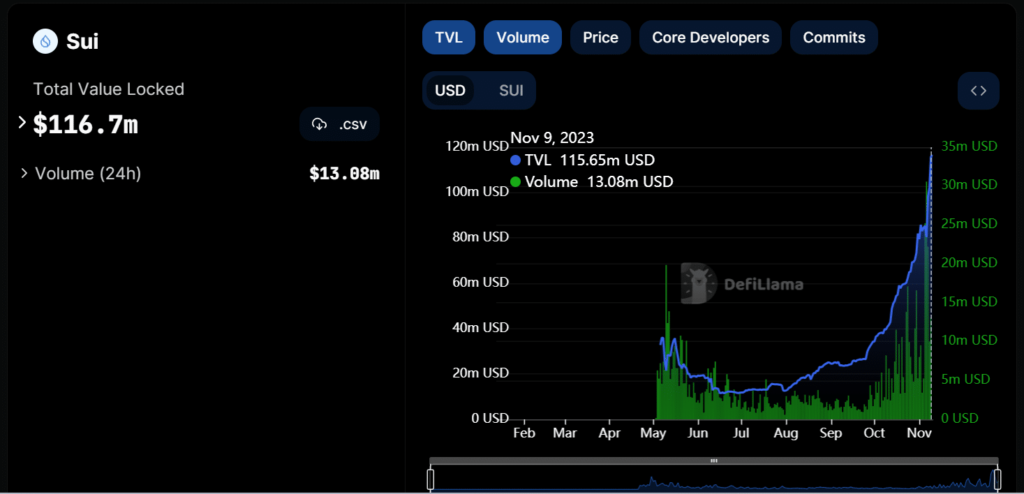 Además, la plataforma ha experimentado un mayor volumen diario, y las cifras recientes marcan el nivel más alto desde su lanzamiento. El 5 de noviembre, el volumen alcanzó un máximo de 30,5 millones de dólares, estableciendo un récord para Sui.