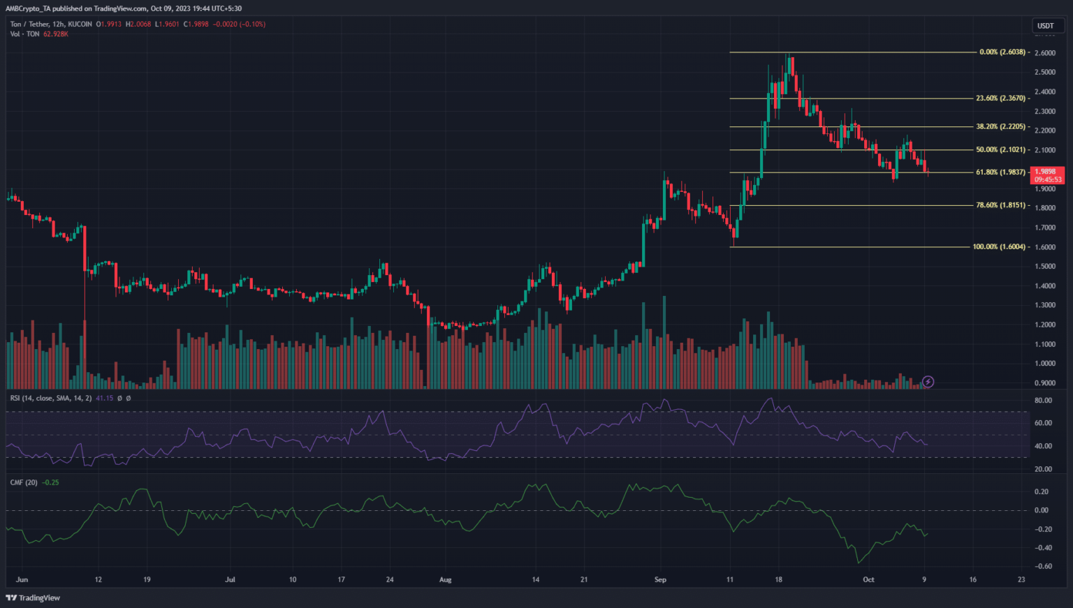 toncoin [TON] El profundo retroceso desde el nivel de precios de 2,6 dólares continuó con otro rechazo en el nivel de Fibonacci del 50% (2,1 dólares). El retroceso inicial hizo que el valor de TON cayera más del 25% entre el 20 de septiembre y el 4 de octubre.