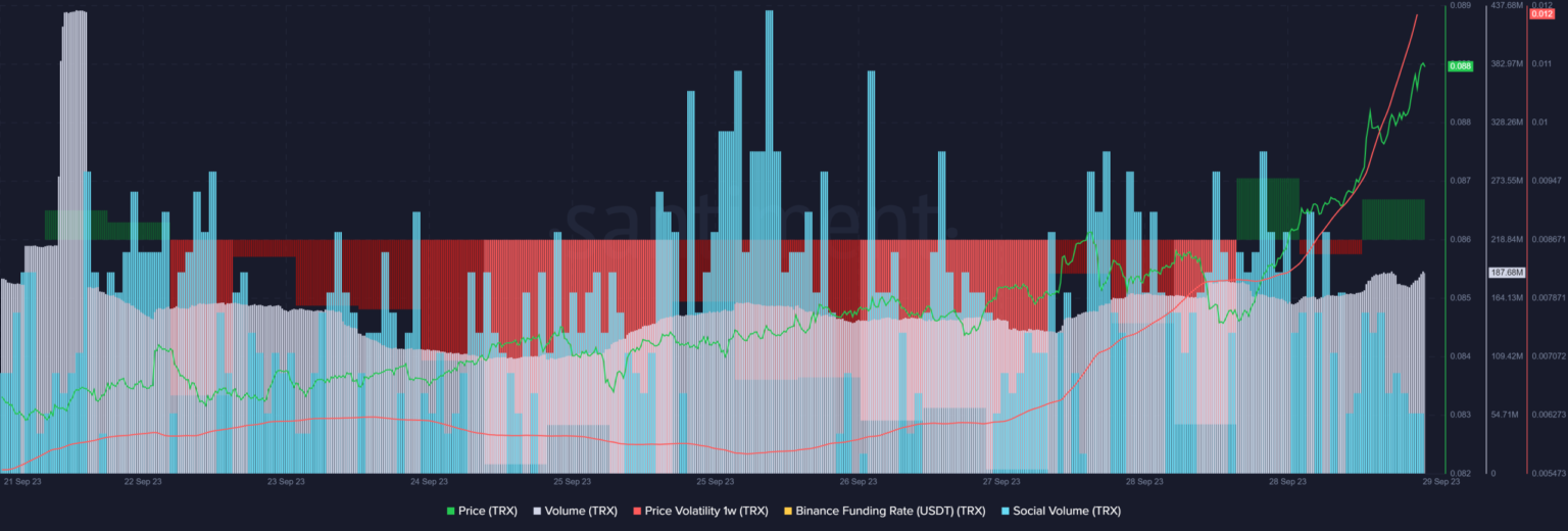 TRXLa demanda de en el mercado de derivados también aumentó, como lo demuestra su tasa de financiación verde de Binance el 29 de septiembre. Sin embargo, la tendencia alcista no tuvo un impacto positivo en el desempeño de TRX en el frente social, ya que su volumen social disminuyó ligeramente.