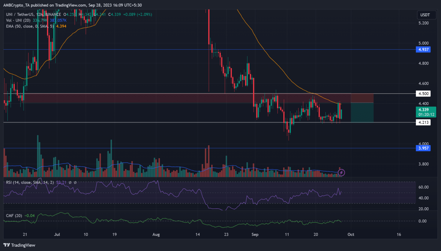 Uniswap [UNI] Los vendedores han estado aprovechando el obstáculo de 4,5 dólares para buscar ganancias. Al cierre de esta edición, UNI enfrentó una reversión de precios y cotizaba a 4,34 dólares. Pero el obstáculo tuvo una confluencia con 50-EMA (media móvil exponencial) en el período de 12 horas y podría atraer vendedores.