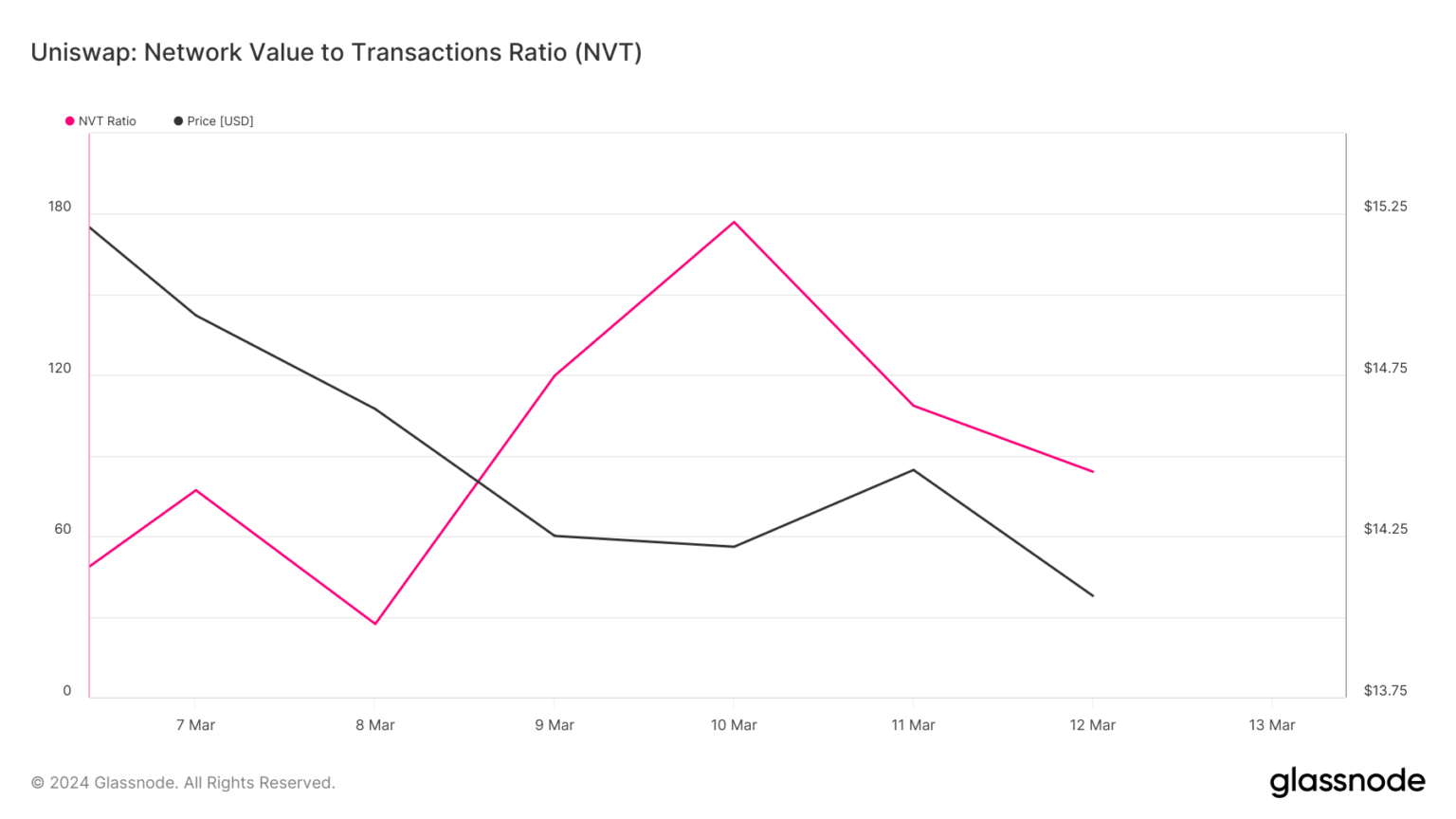 Un análisis de los datos de Glassnode reveló que las posibilidades de que continúe la tendencia alcista son altas. La relación valor de red / transacciones (NVT) de Uniswap cayó recientemente.