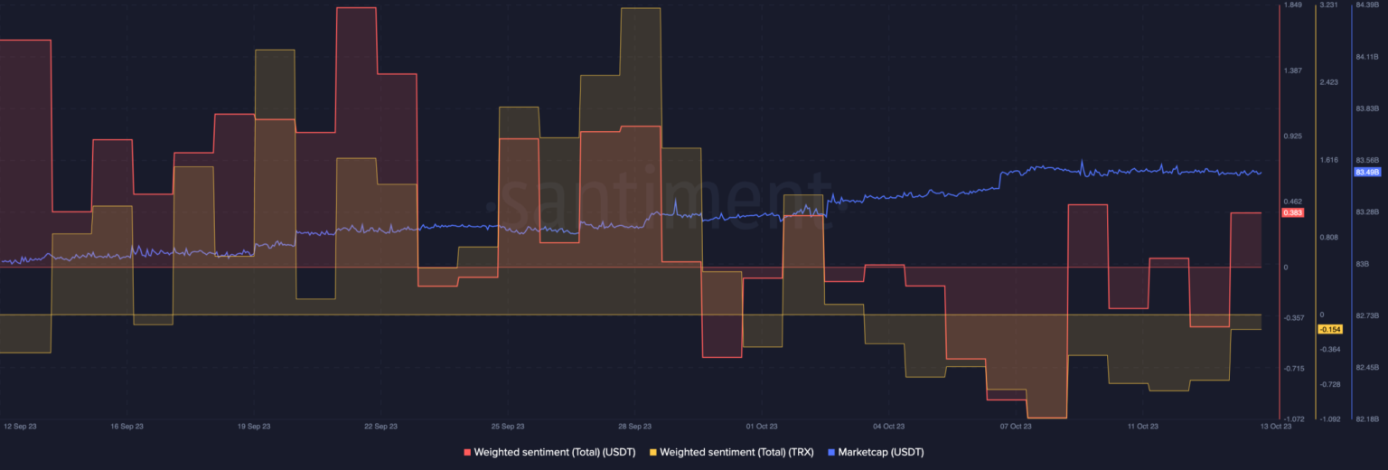 Si bien el sentimiento ponderado hacia Tron ha experimentado una disminución, el sentimiento ponderado del USDT se mantuvo relativamente alto.