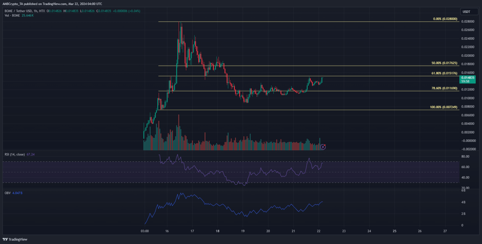 Sin embargo, el RSI en el gráfico de una hora volvió a subir por encima del nivel neutral 50 el 21 de marzo. BOME también superó la resistencia a corto plazo de 0,0134 dólares. Este fue un avance positivo. La estructura del mercado mantuvo su sesgo alcista ya que el precio no ha caído por debajo de 0,007249 dólares, el mínimo reciente.