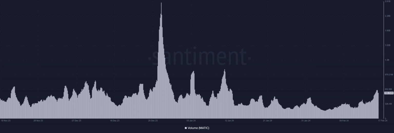 Un examen del volumen del polígono en las últimas 24 horas en CoinMarketCap reveló un aumento de casi el 8%. Un análisis más detallado de la tendencia del volumen en Santiment durante los últimos dos días mostró que el volumen alcanzó niveles que no se habían visto en semanas.
