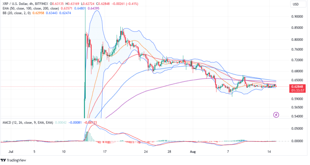 Sin embargo, la tendencia alcista que apunta a $0.7, $0.85 y $1 puede tardar más en materializarse en medio de la acción lateral en curso. El indicador de convergencia/divergencia de la media móvil (MACD) valida el movimiento de rango en el mismo marco de tiempo de cuatro horas.