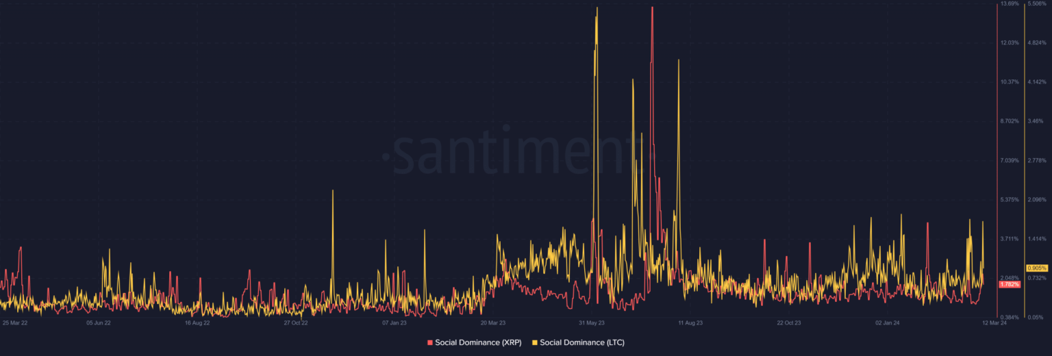 Según el análisis de AMBCrytpo a través de Santiment, el dominio social de XRP aumentó a alrededor del 2,24%. Litecoin hizo lo mismo con un aumento del 1,2% el mismo día.